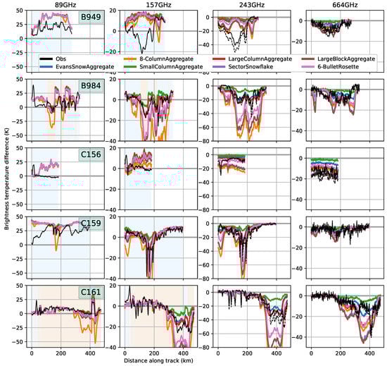 Figure 6 compares the observed and simulated brightness temperatures along the aircraft track for each case study flight for the 89, 243 and 664 GHz channels. These have been chosen to illustrate the behaviour across the range of frequencies available, and since they are quasi-window channels they show the greatest sensitivity to the presence of cloud at all altitudes. Equivalent plots for the other available channels can be found in the supplement (Figures S5–S9). To emphasize the signal due to cloud, the plots show the difference between the observed or simulated brightness temperatures and equivalent "clear-sky" simulations. The clear-sky simulations account for gaseous absorption and emission, and surface emission and reflectance, but they do not include scattering or absorption from cloud hydrometeors. For the simulations, the difference between cloudy and clear-sky brightness temperatures is a true representation of the signal from the cloud, but for the observations it also includes differences due to any errors in model temperature and water vapour fields, surface properties and gas spectroscopy. For example, during B984, C159 and C161 brightness temperature differences between observations and clear-sky simulations are seen for all channels close to the centres of the water vapour absorption lines at 183, 325 and 448 GHz (Figures S6, S8 and S9). This suggests there are errors in the NWP model upper tropospheric water vapour. Nevertheless, the differences are generally small for scenes containing little cloud, which gives confidence that the clear-sky simulations are sufficiently accurate to derive the cloud signal from the observations for all but the thinnest clouds. For channels where only a single polarisation is observed, the horizontal and vertically-polarised simulations have been appropriately combined to give the brightness temperature at the observed polarisation. For channels where dual polarisation is observed, the simulated intensity is plotted and the observations are shown for both polarisations. Note that since all ice crystals are assumed to have random orientation, the simulated polarisation difference will be small for channels which are not generally sensitive to the surface, i.e., all channels except 89 and 157 GHz. The primary surface type for each observation (land or sea) is indicated by the background shading on the 89 GHz plots.