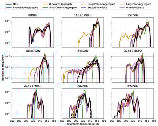 Brightness temperature histograms for observations and simulations using different ice particle habits for selected channels. The dashed black lines at 243 and 664 GHz represent the horizontally-polarised observations, and the solid black lines represent the vertically-polarised observations. Results for other channels can be found in Figure S11 in the Supplement.