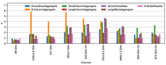 Histogram fit parameter using different ice particle habits for selected channels. Results for all channels can be found in Figure S12 in the Supplement.