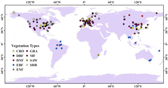 Rn products and LE models were validated and assessed using ground-measured data from in-situ radiation measurements and eddy covariance flux tower sites. The ground-measured data from 240 in-situ measurements were provided by AsiaFlux, AmeriFlux, LathuileFlux, the Asian Automatic Weather Station Network (ANN) Project, the Chinese Ecosystem Research Network (CERN), and the individual principal investigators (PIs) of the FLUXNET website (https://fluxnet.org/). The in-situ measurements were mostly distributed in North America, Europe, and Asia (Figure 1). We acquired ground-measured data from 240 in-situ measurements, including 34 cropland (CRO) sites, 6 deciduous needleleaf forest (DNF) sites, 28 deciduous broadleaf forest (DBF) sites, 16 evergreen broadleaf forest (EBF) sites, 64 evergreen needleleaf forest (ENF) sites, 10 savanna (SAW) sites, 14 shrubland (SHR) sites, 12 mixed forest (MF) sites, and 56 grass and other types (GRA) sites, between 2001 and 2009. The LE and Rn from ground-measured data can have an error of 10% [41]. The ground-measured datasets included hourly or half-hourly LE, Rn, sensible heat flux (H), and soil heat flux (G) data. The missing data of LE and Rn were gap-filled using the MDS method [42]. Daily LE and Rn values were aggregated from half-hourly and hourly LE and Rn data. Covariance flux towers measured LE by the EC method, which has an issue of energy imbalance [43,44]. To correct the measured LE, we used the method proposed by Twine et al. [42]. The method can be written as