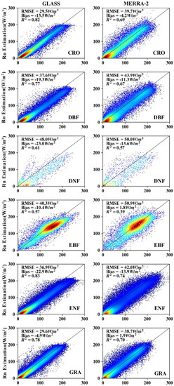 Rn scatter plots between ground-measured Rn (x-axis, unit: W/m2) and the estimated Rn from two products (GLASS and MERRA-2) (y-axis, unit: W/m2) at 240 in-situ radiation measurements for different land cover types. Rn, radiation; GLASS, Global LAnd Surface Satellite; MERRA-2, Modern-Era Retrospective Analysis for Research and Applications-version 2.