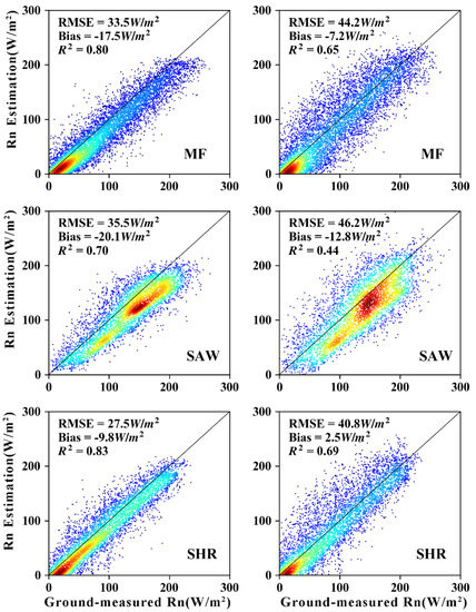 Overall, the GLASS Rn accounted for 57–83% of Rn variability for all ground-measured data, whereas the MERRA-2 Rn only explained 39–69% of Rn variability (Figure 2). The GLASS Rn product had better performance than the MERRA-2 Rn product (R2 increased by approximately 0.10, and RMSE decreased by approximately 7.7 W/m2). The higher accuracy of the GLASS Rn might result from the finer spatial resolution of the GLASS product.