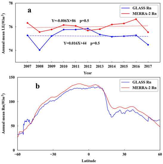 In this study, we first assessed the accuracy of two Rn products using 240 ground-measured data. Our result showed that GLASS Rn had higher accuracy than MERRA-2 Rn for all land cover types on a daily scale ( increased by 0.04–0.26, and RMSE decreased by 2–13.3 W/m2). The daily Rn from GLASS product agreed better with the ground-measured data for different land cover types, indicating GLASS Rn had better performance than MERRA-2 Rn. The differences between the GLASS Rn and MERRA-2 Rn led to a large discrepancy in the estimation of annual LE on a global scale. The mean annual LE for the whole globe based on the GLASS Rn was 2% lower than that based on the MERRA-2 Rn. During the period from 2007–2017, the annual LE simulated from the GLASS Rn increased by over 3%, while it only increased by 2.5% from the MERRA-2 Rn.