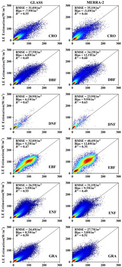 Figure 6 presents the scatter plot between the LE estimations from the two Rn products using the SA model and ground-measured LE for different land cover types. At the site scale, we found a large difference in the LE estimation from the two Rn products among different land cover types. For the EBF sites, both GLASS-based LE and MERRA-2-based LE had the lowest R2 (0.47 and 0.35) and the highest RMSE (32 W/m2 and 40.4 W/m2). For the CRO sites, GLASS-based LE had better R2 (0.55) and lower RMSE (31 W/m2) than MERRA-2-based LE (R2: 0.44, RMSE: 35.1 W/m2). GLASS-based LE had the highest R2 (0.72) for SAW sites, whereas MERRA-2-based LE exhibited the highest R2 (0.64) for MF sites. For the DNF sites, both GLASS-based LE and MERRA-2-based LE presented the lowest RMSE (20.9 W/m2 and 23.9 W/m2). For different land cover types, the comparisons between the GLASS-based LE and MERRA-2-based LE showed that the GLASS-based LE had better performance. The values of R2 for LE estimated by GLASS (0.47–0.72) were much higher than LE simulated by MERRA-2 (0.35–0.64). Similarly, the values of RMSE for LE estimated by GLASS (20.9–31 W/m2) were much lower than LE simulated by MERRA-2 (23.0–35.1 W/m2). In comparison to ground-measured LE data, most land types of the two LE products (except CRO) yielded higher values than ground-measured LE. For the CRO sites, the two products underestimated the values of LE since they did not consider the influence of irrigation on LE. Although the GLASS-based LE did not result in a better bias for CRO, it still had higher R2 and lower RMSE than MERRA-2-based LE. For all land cover types, GLASS-based LE had better accuracy than MERRA-2-based LE. This indicated that the performance of the Rn product affected the accuracy of the LE product.