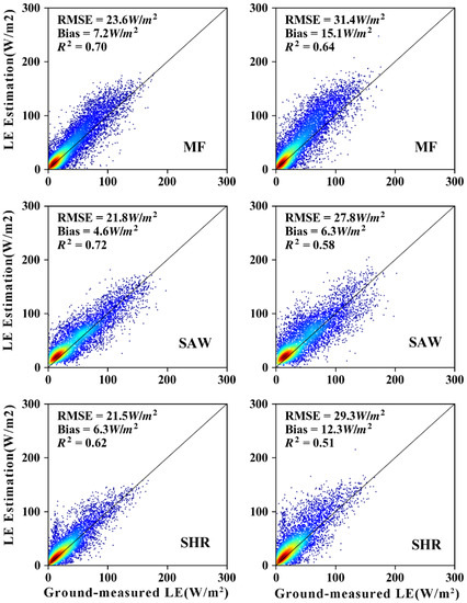 LE data simulated by six models were also validated using flux tower sites (Table 1). The GLASS-based LE had higher R2 and lower RMSE compared to the MERRA-2-based LE for different LE models (R2 increased by 0.04–0.11, and RMSE decreased by 3–6.8 W/m2). For GLASS-based LE, both the PT-JPL and SA models had the highest R2 (0.6) and better performance, whereas SA exhibited lower RMSE than the PT-JPL model. The SW model had the lowest R2 (0.53) and the worst RMSE (31.7 W/m2) for GLASS-based LE. For MERRA-2-based LE, the SA model also had the highest R2 (0.52) and the lowest RMSE (31.8 W/m2). The SIM model exhibited the lowest R2 (0.48) for MERRA-2-based LE, yet the SW model showed the highest RMSE. We found that the SA model had better performance than individual terrestrial LE models for both GLASS-based LE and MERRA-2-based LE. We, therefore, validated the LE of the SA model using flux tower sites for different land cover types.