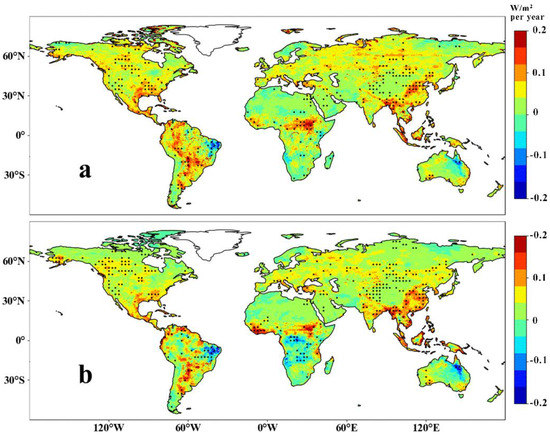 Trends of GLASS Rn (a) and MERRA-2 Rn (b) during the period of 2007–2017. The black points refer to pixels with 95% confidence.