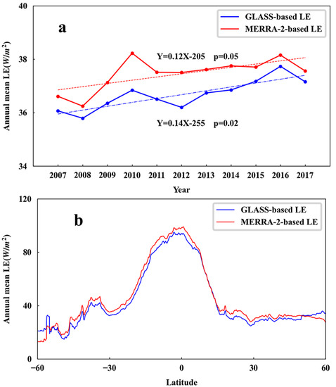Figure 9a illustrates the trends of globally averaged annual LE based on the two Rn products during the period 2007–2017. The globally averaged LE showed significant upward trends for the two Rn products. The two globally averaged annual LE exhibited small discrepancies that ranged from 0.4 W/m2 to 1.39 W/m2. The GLASS globally averaged annual LE ranged from 35.8 to 37.7 W/m2 compared with MERRA-2 globally averaged annual LE from 36.2 to 38.2 W/m2. The GLASS globally averaged annual LE was slightly lower than MERRA-2 globally averaged annual LE. Figure 9b shows that the zonal means of two LE products during the period from 2007–2017 changed with latitude. MERRA-2-based LE had higher values between latitudes of 55°S and 47°N, whereas GLASS-based LE had higher values in high latitude areas.