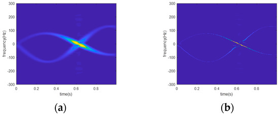 Time-frequency (TF) representations of cone-shaped target. (a) Short-time Fourier transform (STFT); (b) synchroextracting transform (SET).
