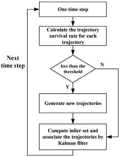 - Trajectory correction strategy is performed for each time step to correct the association mistakes caused by the intersections and noise. The RANSAC algorithm is utilized to generate trajectories when the trajectory survival rate is lower than the threshold . The basic idea of RANSAC is to form simple data association hypotheses from a batch of data and verify it to the data. As an iterative algorithm, RANSAC contains two sections: hypothesis generation and hypothesis evaluation [21]. In the hypothesis generation phase, RANSAC chooses a subset of data at random, and then estimates the parameters from the samples. Many assumptions are generated during the iteration. In the hypothesis evaluation phase, the most likely hypothesis is selected according to the maximum inlier candidates. A subset of data is considered as the inlier candidate, whose error is assumed to be within a predefined threshold. RANSAC is popular until now because it is easy to implement. The signal can be approximately regarded as the linear chirp signal in a short time, i.e., the trajectories in the short time window can be regarded as a simple straight line approximately. The windowing technique is used in the trajectory correction strategy to improve computational speed of the RANSAC algorithm. If the wrong association occurs because of the intersections and noise, subsequently, the false predicted state vector is obtained. In this case, the inlier point set obtained by the false state vector does not contain the points correspond to the true IF, and the trajectory survival rate will drop rapidly.