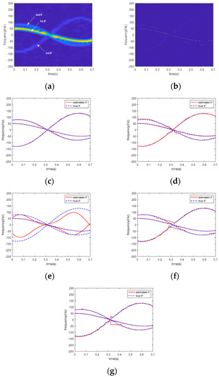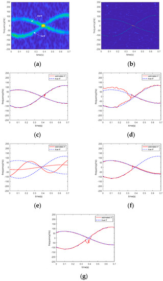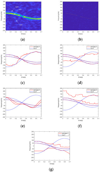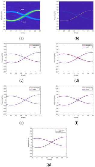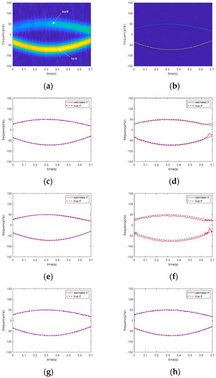 In Figure 8 and Figure 9, (a) and (b) give the TF representations obtained by the STFT and SET, (c)~(g) show the IF estimation results of the proposed method and other compared methods. It is noted that the CSRDI-MGPTF algorithm has the best estimation result at . Nevertheless, in the case of , the residual component energy by the multicomponent signal separating method in the CSRDI-MGPTF algorithm may be larger than the other component energy, and this can cause serious estimation mistake for the other component. As shown in Figure 9e, the second IF is not accurately estimated. By contrast, the MKF algorithm still works well in the case of , which denotes that the proposed algorithm has a good noise robustness. For the MTT, MD-STFT, and MD-SET algorithms, the IF estimation results at , shown in Figure 8b,d,f, have an obvious estimation error near the intersection. Moreover, when , the MTT and MD-STFT algorithms have worse estimation results for the second IF component.