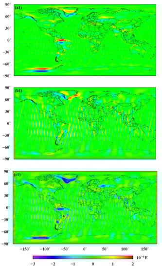 Due to the limitations of GRACE satellite observations themselves (hybrid effects of satellite orbit errors and correlated errors of Stokes coefficients), oceanic and atmospheric model errors, the time-varying gravity field models obtained by GRACE have obvious north–south oriented high-frequency strip errors [17,56]. To reduce these artifacts, a Gaussian filter, decorrelated filter, Fan filter and other filters can be adopted. Here we only used 300-km Gaussian filtering to show the suppressive effect of the first-order northern co-seismic GGCs on the north–south strip error without decorrelation filtering. However, a single filter has its limitations, thus, there are residual stripes in Figure 5, especially in Figure 5b1,c1