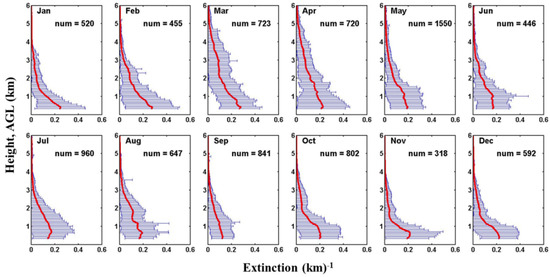 Figure 2 shows the vertical profile of aerosol extinction coefficient for each month averaged for the period of 2005–2012. As is clearly seen in Figure 3, the extinction coefficient extended from the surface to ≈6 km during March, April, and May, whereas the extinction coefficient was almost zero at ≈4 km during other months. A small aerosol layer at 2–4 km was observed over the region during March. This type of aerosol layer is mainly attributed to the dry convicting lift of air pollutants from far-off regions and subsequent horizontal transport of aerosols ([23,68]). On average, the vertical aerosol distribution follows the scale height, higher aerosol extinction near the surface and decreases as height increases.