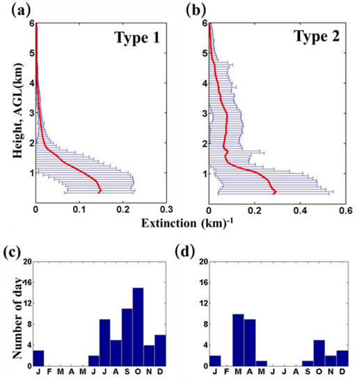 Two-layer structured vertical profiles have been classified as type 2 ([23]). In this type, we found another peak with an aerosol extinction coefficient at 2–4 km in addition to the extinction coefficient peak that appears at the near surface. Lower than 2 km, the aerosol vertical profile has a similar impact as type 1, but at the 2–4 km range, the average extinction coefficient is 0.25 km−1 in type 2, whereas it is only less than 0.1 km−1 in type 1. The two-layered structure mainly occurs in spring and winter seasons, and a few days in other months, as shown in Figure 3d.