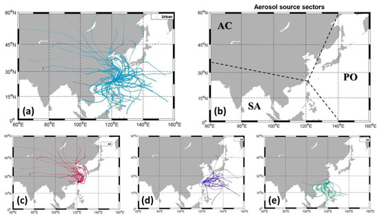 In order to explore the possible sources and types of aerosols, the backward trajectory simulations were employed. Five-day back trajectories (Figure 4a) made at a height of 500 m represent the occurrence height of maximum aerosol extinction. The back trajectories for type 1 showed disorder and originated from all the directions. We further divided the total area into three regions (Figure 4b), viz., the Asia continental region (AC; Mongolia, Tibet, Xinjiang, North China and Central China region, Japan, and South Korea), the Pacific Ocean region (PO; Northwestern Pacific), and the Southeast Asia region (SA; Southeast Asia and southern China). Back trajectory analysis showed that a total of 28 day (number of data points = 458), 12 day (number of data points = 59), and 21 day (number of data points = 154) air masses were coming from AC, PO, and SA regions to EPA-NCU site, respectively (Figure 4c,e). It is important to note that few trajectories passed through more than one region, which resulted in double counting of data numbers in Table 1.