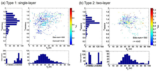 According to the discussion in Section 3.2, the air masses in the PBL and free atmosphere could be from different source origins and imply different aerosol types. In order to clearly define the impacts of vertical distribution on the optical properties (i.e., τ500, α440/870, and Sp), we divided the classification of vertical distribution into two categories based on [23], i.e., single-layer (type 1) and two-layer (type 2) aerosol structures of the aerosol extinction coefficient.