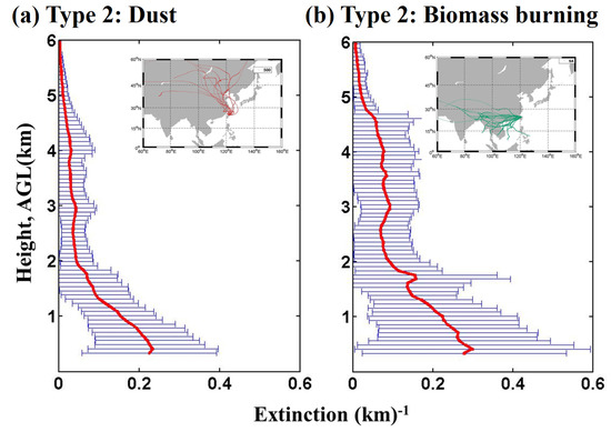 Averaged aerosol extinction profiles for (a) type 2 dust source and (b) type 2 biomass-burning source. In the subplots, the respective air mass backward trajectories for dust (ended at the height of 500 m) and for biomass-burning (ended at the height of 3 km) cases are illustrated.