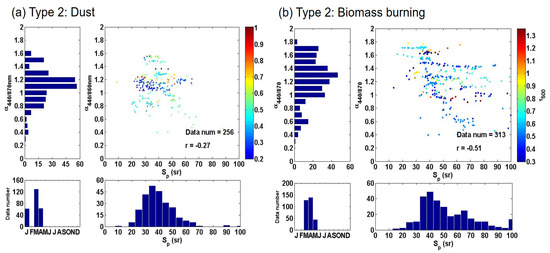 Combining information of α440/870 and Sp can help us to distinguish the aerosol types. Figure 5a shows the scatter plot of α440/870 and Sp with code denoting τ500 together with the histograms representing spread of samples and color magnitude of for type 1. The τ values were in the range of 0.1 to 0.6, with an average value of 0.21; α440/870 was between 0.6 and 1.8, with an average value of 1.26 ± 0.31. The Sp is concentrated between 30 and 60 sr with an average of 39 sr. Previous studies reported that the Sp values of (37 ± 9) sr and (33 ± 6) sr were for dust and marine aerosols, respectively [69].