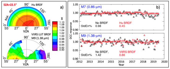 Recently, Bhatt et al. [17,39] revised the baseline DCC approach to extend its effective application to SWIR bands. A key step in the revised method is the band-specific characterization of the DCC reflectivity as a function of solar zenith angle (SZA), viewing zenith angle (VZA), and relative azimuth angle (RAA) using empirically derived look-up table (LUT) BRDF models that are formulated using the first five years of Suomi National Polar-Orbiting (SNPP)-VIIRS DCC measurements acquired globally near the tropics. The VIIRS-based LUT BRDFs for the VIS-NIR bands look similar and resemble the Hu angular distribution model closely. However, the DCC BRDF patterns were found unique for each of the SWIR bands. Figure 1a shows the comparison between the Hu ADM and the LUT BRDF for the 1.38 µm channel (M9) on SNPP-VIIRS for SZA = 22.5°. The BRDF factor (χ) is nearly symmetric about RAA = 90° for the Hu model, which is valid for VIS-NIR wavelengths. On the other hand, the M9 band reflectance is non-symmetric about the RAA and exhibits a greater reflectance in the forward-scattering direction (RAA < 90°). These contrasting BRDF features imply that a wavelength specific BRDF is necessary for employing the DCC method for SWIR bands. The application of these LUT BRDF models was shown to effectively reduce the SWIR band DCC temporal variability by up to 65% [40]. Figure 1b shows the normalized DCC reflectance time series for SNPP-VIIRS M7 (0.86 µm) and M9 bands with (red triangles) and without (black triangles) the BRDF corrections. The application of Hu ADM reduces the temporal standard error by more than 50% in the M7 band DCC time series. The M9 band is located in a strong atmospheric absorption band, and the ground PICS are not visible with this spectral channel. Therefore, the high-altitude DCC are the only invariant Earth targets available for vicarious calibration of the 1.38 μm band. The application of the LUT BRDF reduces the temporal natural variability of the VIIRS M9 band DCC response to less than 1%. Bhatt et al. [40] showed that the revised DCC approach can detect an instrument degradation trend of <1%/decade in all reflective solar bands at the 5% significance level (or 95% confidence level) and 50% probability of significant trend detection.