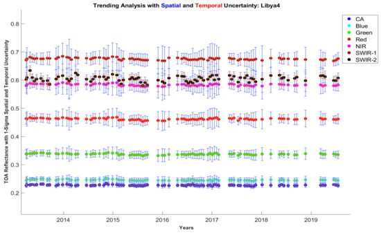 Trending of Landsat 8 OLI using Libya 4 PICS. Each set of data represents a spectral band. Uncertainties shown include estimates of both temporal and spatial uncertainty.