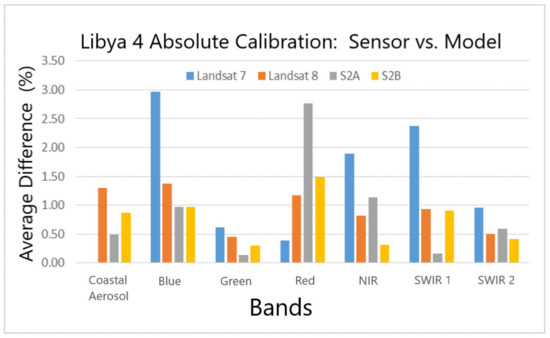 Absolute radiometric calibration using PICS has also been developed [42,43,44]. Use of PICS for absolute calibration of optical remote sensing instruments requires incorporating either a calibrated source, normally the sun, or a calibrated sensor (radiometer), normally a well-accepted sensor system (an example would be MODIS Terra) already on orbit. Thus, fundamentally, the accuracy of the model is primarily dependent on the accuracy of the corresponding source or sensor. An example of absolute radiometric calibration using a model developed for Libya 4 by South Dakota State University is shown in Figure 3. Average results of using the model to predict TOA reflectance for Landsat 7, 8 and Sentinel-2 A, B sensors are shown. For this model the average difference between model predictions and sensor measurements is less than 3% in all cases and approaching 1% or better for several sensor/band combinations. This model is based on the MODIS Terra sensor and, at the very least, shows excellent agreement among all five sensors. These results suggest potential for PICS to yield absolute calibration models with accuracies of 3% or better.