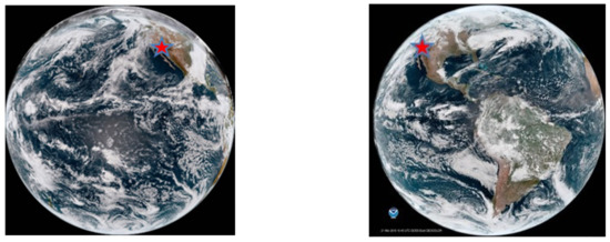The GOES-West image on the left shows Goes-17 monitoring of the western portion of North America while the image on the right show Goes-16 monitoring the eastern half of North America. The red stars indicate both can monitor the Sonoran Desert PICS.
