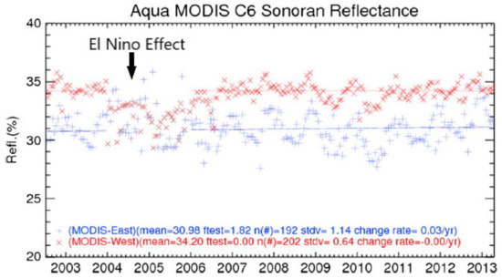 Fundamentally, PICS are useful for both sun-synchronous and geosynchronous sensors. However, while sun-synchronous sensors will normally view any given PICS on a regular basis, geosynchronous sensors essentially stare at the same portion of the Earth’s surface continually. Thus, there is the distinct disadvantage that some PICS will never be observed, and the distinct advantage that other PICS may be observed on an almost continuous basis. It is imperative, therefore, that PICS are located as globally as possible. Fortunately, algorithms and recommendations were developed to accomplish this [45]. As an example, GOES-East and GOES-West are designed to monitor the continental United States as shown in Figure 4. Neither can monitor Saharan PICS, however, both can continuously monitor the Sonoran Desert PICS (indicated by red star in Figure 4). Unfortunately, due to increased influence from vegetation and nearby water bodies, the Sonora Desert is not as stable as Saharan sites (Figure 5). However, for applications of cross-calibration of sensors, there is a tremendous advantage to exploiting the observations of geosynchronous sensors such as GOES-East and GOES-West coupled with observations of sun-synchronous sensors such as MODIS, Landsat, and Sentinel-2. While geosynchronous sensors are limited in viewing angle, they can track illumination angle through the day. Conversely, sun-synchronous sensors are limited in illumination angle, but can provide additional viewing angles (compared to geosynchronous view angles, which can be limited to extremely off-nadir looks). Thus, by integrating all these observations together, and taking advantage of the substantial increase in observations, many of these uncertainties can potentially be reduced leading to substantial improvement in the use of the Sonora Desert as a PICS. Other examples are possible worldwide. This is a largely unexploited area of calibration activity that should be more aggressively pursued.