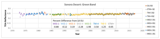 Observation of the Sonora Desert PICS over time for Landsat 1–8 after cross-calibration. Prior to calibration, differences between sensors were as large as 15%, following calibration differences are on the order of 3% or less.