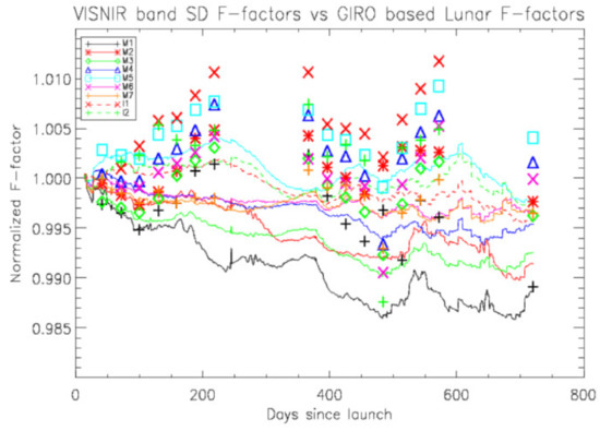 Since there is a large bias in the ROLO model in the absolute radiometric scale because of atmospheric correction error and high uncertainty in Vega absolute irradiance, which is used to scale ROLO, the lunar F-factors can only be used for long-term relative calibration [51]. An optimal scaling factor is calculated by minimizing the differences between the SD F-factors at the time of lunar F-factor calculation in each band as shown in Figure 7. In Figure 7 top plot, the solid line represents SD F-factors and the symbols are the lunar F-factors. The dashed vertical lines are the year division lines and the lunar F-factors are not available from July to October because the moon goes below the Earth limb. The long-term trends between SD and scaled lunar F-factors showed reasonable agreement. The standard deviations of the lunar F-factors to the SD F-factor were less than 1% in all the RSB bands [52].