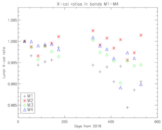 For lunar-based cross-calibration, there were 14 lunar collection pairs available. The lunar cross-calibration ratios are calculated and plotted in Figure 8. Figure 8 shows only bands M1 to M4 in the short wavelength side that had SD and lunar F-factor discrepancies with NOAA-20 VIIRS.