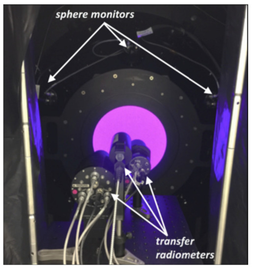 The heart of the GLAMR facility is a collection of tunable laser systems that can collectively lase at any wavelength between 340 and 2500 nm. The outputs of the laser systems are coupled to a 30 in diameter integrating sphere via fiber optic cables. The radiance inside the sphere is monitored by three permanently mounted radiometers, so called sphere monitors (Figure 9). These radiometers stare at the back of the sphere, at the same location an instrument in front of the sphere would see. The NIST-traceable absolute calibration is transferred to the sphere monitors via a set of transfer radiometers that are regularly calibrated by NIST, with accuracies between 0.1 and 1% (k = 1). Maximum signal levels vary based on spectral region but range from several milliwatts to several Watts and are generally tunable to the noise floor of the instrument. Spectral traceability is achieved by continuous measurement of the laser system output by laser spectrum analyzers and wavemeters, with accuracies of 0.01 to 1 Å, depending on the spectral region.