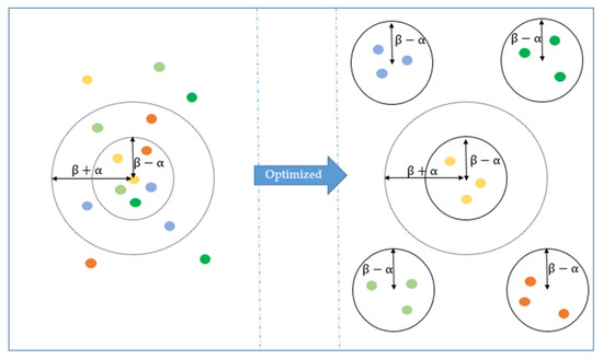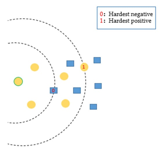 Different colors represent different categories: the centered yellow point is the anchor. The yellow point with the red “1” is the positive sample farthest from the anchor, which represents the hardest positive sample. Then, blue with the red “0” is the closest negative sample to the anchor. We draw two semicircles on the basis of these two points, and then all points inside the ring are informative samples because, in loss computation, they can provide more valuable information and make the training process converge quickly.