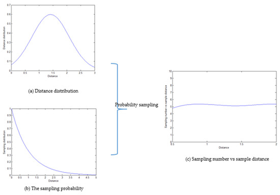(a) The distance distribution. (b) The sampling probability. (c) Sampling number vs. sample distance.