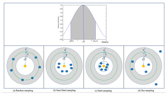 Four sampling methods are shown in (a–d). The above figure shows the distribution probability density of sample distance. As the sample distance roughly follows a normal distribution (), we put the mean at , and is a randomly selected boundary to denote a centrally symmetrical distribution area (the shaded zone). In the subfigures below, the centered yellow point represents the anchor, and the blue points represent the negative samples selected by different sampling methods. In (a), most of the selected samples are gathered in the shaded zone around in random sampling. (b) represents semi-hard sampling. The selected samples need to be close to the anchor, but not as close as that needed in hard mining. (c) shows hard sampling. A predefined boundary (denoted by the blue circle) is used to filter hard negative samples. Thus, the selected samples are gathered more closely to the anchor than those in semi-hard sampling. (d) Our proposed sampling strategy. The selected samples have a scattered distribution to maintain diversity in the training batch.
