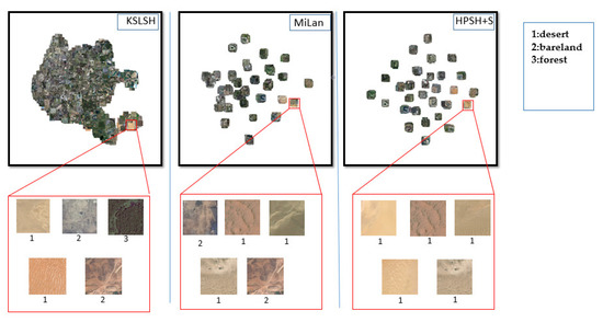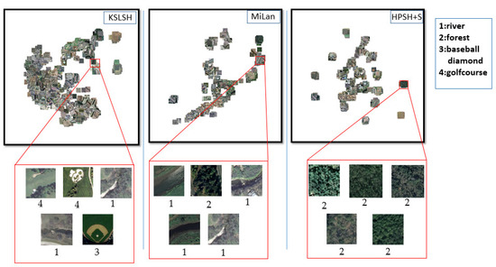 t-SNE 2D scatterplots comparing the 2D projection of the L-dimensional binary hash codes of the test images in the UCMD dataset. We map the tiny image in the small red box to the big red box, the number under the picture in the big red box represents the category label of the current picture, and the specific category is given in the blue box. The leftmost diagram is the t-SNE 2D scatterplot of KSLSH [9], the middle one is the t-SNE 2D scatterplot of MiLan, and the last one is the t-SNE 2D scatterplot of HPSH+S.
