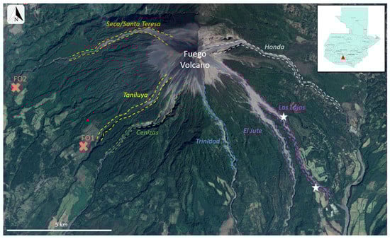 Fuego volcano is located in central Guatemala and has a well-defined summit crater at an elevation of 3763 m. It forms half of the Fuego-Acatenango volcanic complex and is located within the second of eight segments of the Central American Volcanic Arc [20,21,22]. Fuego has experienced five VEI = 4 eruptions in 1581–2, 1717, 1880, 1932, and 1974 [8,23,24]. During its history Fuego has also had more than 60 subplinian eruptions and longer periods (months to years) of low-level strombolian volcanism [20]. This more common activity occurs many times daily and has little to no effect on the local people living in close proximity to the volcano. Since 1999, a new eruptive style began that consists of persistent strombolian activity, lava fountaining, and explosions [20]. It is punctuated by the occasional paroxysmal eruption of greater energy that can produce lava flows and PDCs [8]. Naismith et al. (2019) proposed that starting in 2015 Fuego entered into a different period of even greater volcanic activity. This period follows eruptive activity described by Lyons et al. (2009) but is characterized by a greater frequency of paroxysmal eruptions with the following series of events: (i) effusion of lava flows and an increase in summit activity, (ii) an intense paroxysmal eruption lasting 24–48 h that produces a sustained eruptive column and PDCs, followed by (iii) a decrease in activity [7]. Our study focuses on the PDCs that formed during one of these paroxysmal eruptions on 3 June 2018.