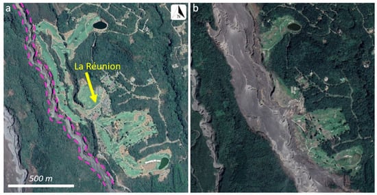 Satellite images of the village of Los Lotes, which is ~1.5 km south of the PDC exit point from Las Lajas barranca. The paved road (RN-14) serves as the primary trade route between Mexico and Guatemala [7]. The boarder of Mexico is ~150 km NW of Los Lotes. (a) 7 March 2018 (prior to the eruption). (b) 14 November 2018 (~5 months after the eruption). Images from Google Earth.