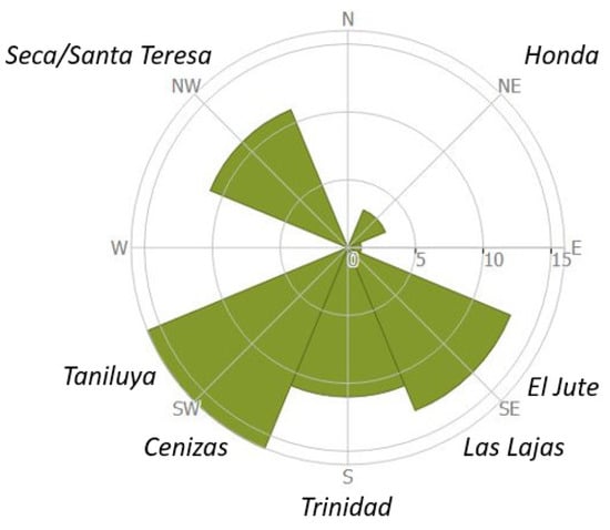 Rose diagram showing the directionality of the PDC events over the ~15-year study period. PDC directionality was determined using both ASTER scenes and INSIVUMEH reports. Sixteen PDCs traveled southwest (Taniluya and Cenizas barrancas), 13 traveled southeast (El Jute and Las Lajas barrancas), 11 traveled south (Trinidad barranca), and 11 traveled northwest (Seca/Santa Teresa barrancas), while only 3 traveled to the northeast (Honda barranca).