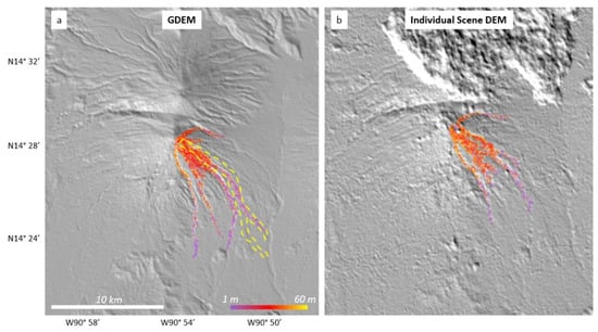A second important model input for VolcFlow is the pre-flow DEM [35]. For this study, two versions of DEMs generated by the ASTER instrument were used. The stated vertical accuracy of the ASTER GDEM product is 20 m, better than a single-scene DEM accuracy of 30 m. The GDEM achieves this improved accuracy and reduction in pixel to pixel noise through averaging large numbers of single-scene DEMs acquired over time. This can create constraints for flow modeling. First, version 2 of the GDEM uses scenes from 2000–2011. Therefore, any topographic changes within this time period are lost. However, if no major topographic changes have occurred, as with Fuego, its use is appropriate. A version 3 GDEM was recently released which uses data from 2000–2013. It was released too late to be incorporated into this study, however the differences between it and version 2 at Fuego were assessed to be negligible. Version 3 contains only minor fixes, such as filling of holes. Second, to account for any significant topographic change, a model requires the most recent (and most accurate) DEM. The use of a single-scene DEM closest in time to an event is potentially more appropriate than using the GDEM. However, as seen by our analysis of the single-scene DEM, the amount of noise and topographic anomalies can adversely impact the modeling in certain locations (Figure 6b).