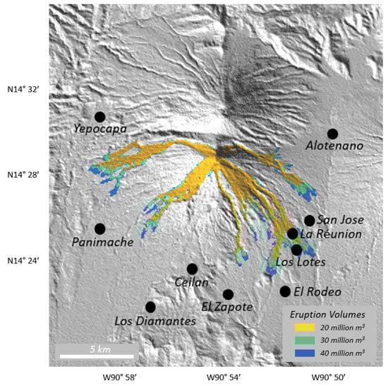 VolcFlow was next run using the GDEM for three increasing volumes to produce a generalized hazard map (Figure 8). For this facet of the analysis, the summit location and elevation were used for the model starting point. The hazard map tends to follow topographic lows as expected. Slight deviations from these occur where the forward momentum of the modeled flow approaches zero and/or where the flows extend beyond the confines of a topographic low. Model results with higher eruptive volumes do increase the potential risk to communities further from the summit of Fuego, as would be expected. The maximum modeled runout distance for a 40 × 106 m3 volume flow is ~10 km from the summit, for example. However, even the smallest volume produces modeled flows that reach the two population centers (Los Lotes and the La Réunion resort) that were directly impacted by the 3 June 2018, eruption, confirming the usefulness of this simplified approach (Figure 8).