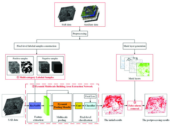 First, all SAR images were preprocessed by radiometric calibration, filtering and geocoding using ENVI SARscape software. Second, pixel-level-labeled samples of multicategory buildings were produced based on the preprocessed SAR data and the auxiliary data using ArcGIS software and the sample images were divided into 256 × 256 patches covering the training set and test set. Then, the pyramid multiscale building-area extraction network based on the residual-feature extraction network and multiscale pyramid-pooling module were constructed. Next, the training set and test set were used to train and test the network, respectively. Finally, the optimized network was obtained. Finally, the preprocessed SAR image was input into the network to obtain the preliminary binary image of building areas, and the final results were obtained by removing non-building mask layers through logical operations.