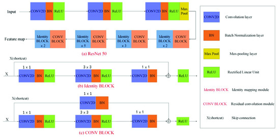 ResNet [43] is based on the convolutional neural networks (CNN) model by introducing a deep-residual-learning framework, and can effectively address the degradation problem with increasing network depth. In this paper, ResNet50 was designed as the feature extraction network of building areas, which is a stack of many identity blocks and convolutional blocks (CONV blocks). The framework of ResNet50 is shown in Figure 3. Figure 3b shows that the identity block is a residual module with a stack of 3 layers, and each layer is composed of CONV2D, Bach normalization (BN), and rectified linear unit (ReLU) with a shortcut connection, in which shortcut connections go across feature maps of two sizes. The shortcut connection, which also denotes identity mapping, is the core idea of ResNet for addressing the gradient degradation problem. The identity mapping sends the feature map of building areas extracted from the shallow network to the deeper network directly across several layers, which can ensure that the details of the extracted texture information do not degrade as the network depth increases. Figure 3c shows the structure of the CONV block. The difference between the CONV block and the identity block is that there is a 1 × 1CONV2D layer in the shortcut connection, which is used to reduce the dimensions of the feature map so that the dimensions of the input match the output connected behind. The identity block and CONV block all use a stack of 3 layers with 1 × 1, 3 × 3 and 1 × 1 convolutions, where the 1 × 1 layers are responsible for reducing and then increasing (restoring) dimensions, leaving the 3 × 3 layer a bottleneck with smaller input/output dimensions. Thus, not only is the accuracy of feature extraction increased, but also the number of calculations is reduced. However, ResNet can only obtain the multilevel texture information of buildings at one scale. For multiscale building distribution, the pyramid module is needed.