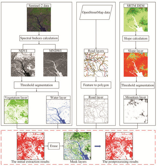 Finally, further postprocessing was needed to eliminate false alarms and improve the extraction accuracy. Common false alarms include vegetation, roads and mountains. Using auxiliary data to obtain several kinds of nonbuilding mask layers, a logic calculation was used to remove the intersection of initial extraction results and mask layers (See Figure 5). The specific steps were as follows: (1) Normalized Difference Vegetation Index (NDVI) and Modified Normalized Difference Water Index (MNDWI) images were obtained from Sentinel-2 optical data using the spectral index module of ENVI Software. Then, appropriate thresholds were set to obtain vegetation and water mask layers. In this paper, the threshold values of vegetation and water mask layers were 0.42 and 0.38, respectively. (1) Road data were obtained from OpenStreetMap open source data website. In this paper, highway, national highway and provincial highway layers were merged to one road layer and then polyline layer was converted to polygon layer; (3) The 30-m SRTM DEM was resampled to 10-m resolution. Then, the average slope was computed in a window around the pixel under test with the slope threshold value 15° [28]. Finally, false-alarm removal work was carried out to erase the mask layers from the initial results layer to obtain the final postprocessing layer.