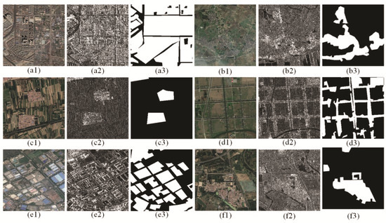 Multicategory-labeled samples. (a1–f1) Google Earth image slices; corresponding (a2–f2) SAR image slices and (a3–f3) pixel-level-labeled samples. Line (a) indicates downtown built-up areas; line (b) indicates mountain villages; line (c–e) indicates plain villages; line (f) indicates urban villages.