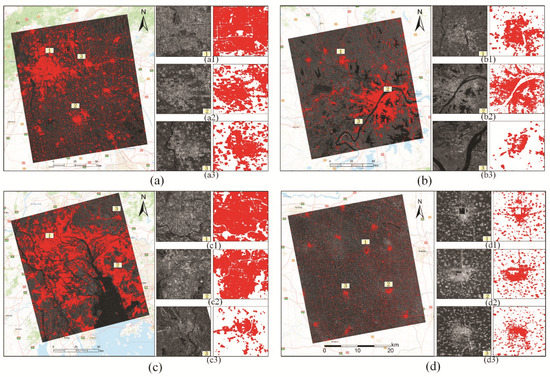 Figure 7 shows the mapping results of four regions based on the pyramid multiscale building-area extraction network proposed in this paper. The results indicate that the building area extracted by the proposed method was basically consistent with the building area representation in SAR images. We can see that the detection results were very good in the urban center, mountainous buildings, suburban villages, dense contiguous building areas and small-scale villages. Figure 8 shows the local region extraction results in detail. The green marks in the first and second columns are flat-roofed buildings and low-rise buildings. In the SAR images, flat-roofed buildings were hollow buildings, and the backscattering values of low-rise buildings were low. The green mark in the third column indicates the village in the mountain area, and the backscattering value was very low, which was difficult to detect. In the last column, buildings close to paddy fields were densely distributed, which were difficult to distinguish from non-buildings in SAR images. As could be seen from figure, all the buildings were detected completely. The global and local extraction results of Figure 7 and Figure 8 show that the proposed method is suitable for multicategory and multiscale regional building areas mapping.