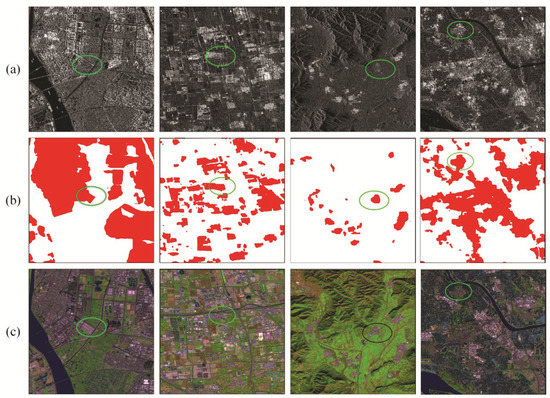 These methods solved the problem of multiscale distribution of buildings in SAR images to some extent, but they have not been applied to large-scale mapping of complex terrain and multicategory buildings. To date, there are two main problems in building-area extraction under the complex background of large regions: (1) Omission errors: Low-rise buildings—such as villages in cities and scattered villages in rural areas—present low backscattering values in SAR images, which are prone to be missed. Some flat-roofed buildings are dominated by single scattering, and the scattering echo is relatively weak. Under some imaging conditions, only linear outlines are displayed in SAR image, which are easy to be omitted; (2) Commission errors: Some roads, bridges and ships exhibit high backscattering and texture characteristics similar to building areas, which easily lead to misclassification.