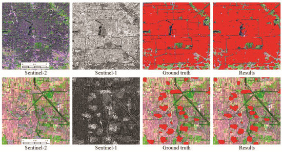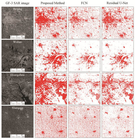 To give a quantitative assessment, the results were compared with the global human settlement layer (GHSL 2014) and finer resolution observation and monitoring-global land cover 10 (FROM-GLC10). The image data of GHSL products with resolutions ranging from 0.5 to 10 m were collected by satellite SPOT (2 and 5), CBERS 2B, RapidEye (2 and 4), WorldView (1 and 2), GeoEye 1, QuickBird2, Ikonos 2 and airborne sensors. The FROM-GLC10 product is a global 10-m resolution land cover map produced by the team of Professor Gong Peng of Tsinghua University using Sentinel-2 optical data. Our results are compared with GHSL and FROM-GLC10 as shown in Figure 9, the results of each region are a whole building area layer containing different buildings. It can be seen that the building area extracted by the proposed method was basically consistent with the other two products. However, GHSL was somewhat overfitting—in which the boundary range and density of urban areas were larger than those of the other two products. For small-scale villages, FROM-GLC10 product missed most of the villages, while our results show a good detection results in small villages. The GHSL product was better than the FROM-GLC10, but worse than our result. Table 5 shows the comparison results of our results and optical products in four regions. For Beijing, our results were consistent with FROM-GLC10 product, but the commission error of FROM-GLC10 was 6.55% and that of GHSL product was 30.40%. For Wuhan, the overall accuracy of our results and optical products was more than 90%, but GHSL product had the highest commission error, which amounts to 10.86%, while FROM-GLC10 product had the highest omission error, reaching 11.76%. For Guangzhou, GHSL product had the highest accuracy and FROM-GLC10 product had the highest commission error. For Shangqiu city in Henan Province, our result had the highest accuracy among the three products, followed by GHSL product and FROM-GLC10 product had the worst extraction effect with 31.3% omission error. On the whole, the commission error of our results was the lowest among the four regions compared with the other products, However, in four regions, the omission error of our results was 6.61% in Beijing and 5.11% in Wuhan, the omission error mainly occurs in the building area with low backscattering values. The texture and geometric structure of buildings in SAR image were incomplete, thus these building features were unstable in the convolution neural network, so as to be divided into nonbuilding areas in the classification layer. For Guangzhou, our result had the highest omission error, because there were many paddy fields in Guangzhou, and some of the ridges and crops had similar characteristics with building areas in SAR data, leading to high omission error. However, from the perspective of spatial scale, our method could still accurately map the regional building areas. In addition, our method could make up for the 10-m resolution optical mapping in a certain extent in terms of small-scale village extraction and provide technical support for the application of surface monitoring based on multi-source remote sensing data.