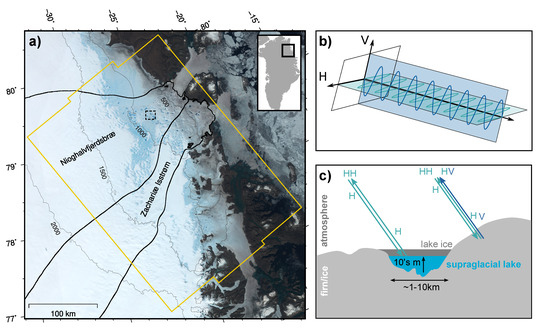 (a) Margin of Northeast Greenland Ice Stream with the drainage basins of Nioghalvfjerdsbræ (also known as 79° North Glacier, 79NG) and Zachariæ Isstrøm (ZI). The yellow outline shows the footprint of the analyzed Sentinel-1 scenes. The image in the background is a mosaic from Sentinel-2 scenes of 1 and 2 August 2019. The dashed black square shows the region of Figure 3. (b) Schematic representation of horizontal and vertical polarization. (c) Characteristic reflection mechanisms on an ice sheet with a supraglacial lake.