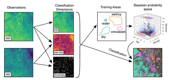 To identify pixels of liquid water in these data, we developed an algorithm based on the machine learning approach of naïve Bayesian classification (e.g., [33]). According to its value in the dimensions HH, HH-HV and the anomaly, we determine the probability that a pixel belongs to a specific radar reflection type. The approach is referred to as "naïve" as it assumes that all dimensions are independent of each other. As we use the difference HH–HV instead of HV and we assume that our spatial anomaly index is also highly independent of the backscattered power itself, we presume that this precondition is met very well.