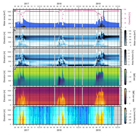 An additional binning of the time series into classes of 100 m elevation steps (Figure 4b) shows that the majority of the water is located in the range of 700–1200 m above sea level in this region. Compared to the total area of the respective zones, the water covers about 2–3% of the surface area between 500 m and 1400 m. Even if more water would typically be expected at lower altitudes, it is not surprising that only very few lakes were detected there, as the lowest 500 m of altitude are relatively steep and crevassed in this region. Elevation bin medians of the backscattered power and the difference HH–HV clearly show the melt periods. In regions with an overall low backscatter in HH and a high difference in HH–HV, different surface types cannot be separated any longer by PolSAR. Similarly binned median ERA-5 reanalysis data [39] confirm temperatures above melting during these periods.
