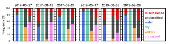 In the first validation we used the same polygons as we used to train the classification scheme, but we checked how the algorithm performed at different epochs. The training polygons cover the period March to September 2018; hence, we chose three epochs of 2017 and three epochs of 2019 for validation. For each year we selected one epoch in spring, one in the peak of the melt season in summer and one epoch in autumn. As in Section 2.2, each polygon was verified by visual inspection of S1 and S2. If any of the polygons did not apply for this period, it was slightly modified or withdrawn. Then, we compared the total area of the test polygons of each class to the classification results, which is displayed in Figure 5. This validation shows that 75–90% of the water polygons were classified correctly, except during the melt season, where the classification agrees with only ~50%. Besides the classification of water, we note that dry shows a nearly 100% match with the test regions, except in August 2019, where we hardly see any dry snow in this region at all. In contrast, the polygons for wet/icy and crevassed yield a relatively large fraction of unclassified and even misclassified cells. This indicates that the separation between these two classes (and water as well) is often difficult. Better classification results for crevasses might be obtained by another spatial parameter as large crevasses often show typical stripe patterns. However, areas with smaller crevasses do not show this pattern as the pixel size of 50 × 50 m is too large to resolve these structures. Nevertheless, our classification is focused on classifying water. The other classes are just used to distinguish water from other surface types, which works quite reliable, except during the melt season.